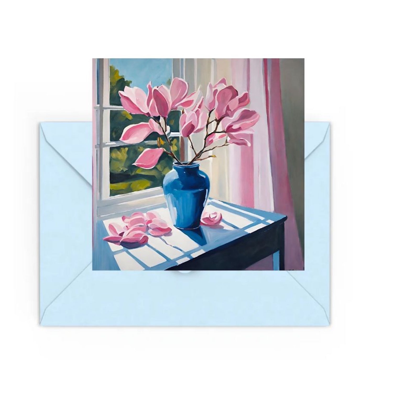 Bring a splash of joy to any room with this playful Giclee wall art print featuring pink magnolias in a charming blue vase.